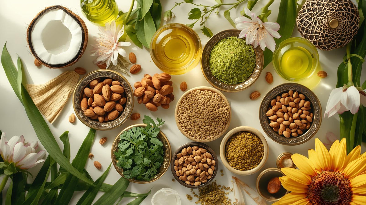 Coconut Oil • Castor Oil • Almond Oil • Olive Oil • Neem Oil • Sesame Oil • Jojoba Oil • Argan Oil • Sunflower Seed Oil • Amla Extract • Bhringraj Extract • Hibiscus Extract • Brahmi Extract • Fenugreek Extract • + Vitamin E